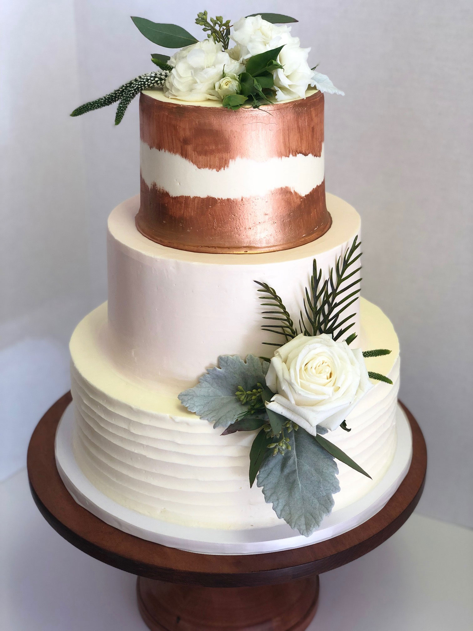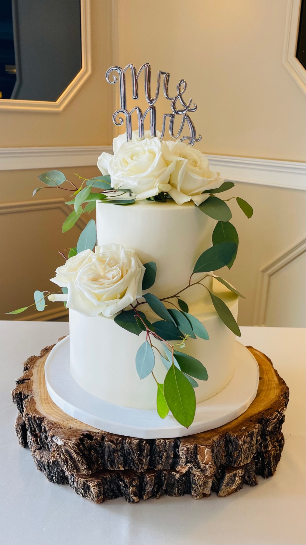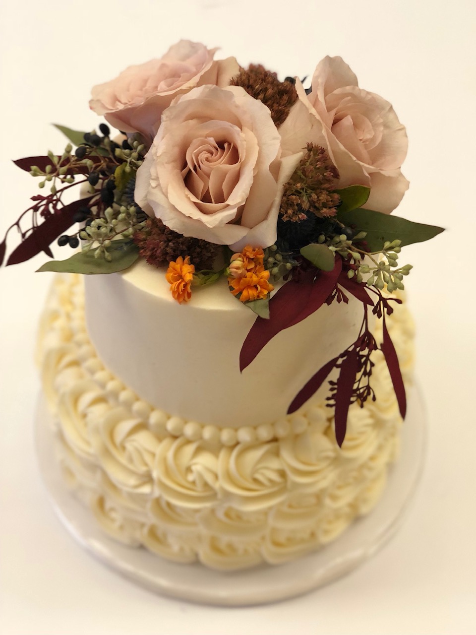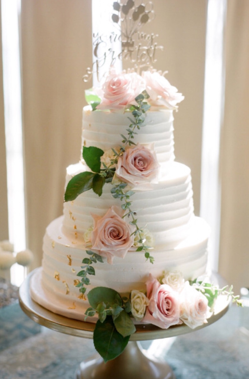 - Buttercream, white roses & eucalyptus