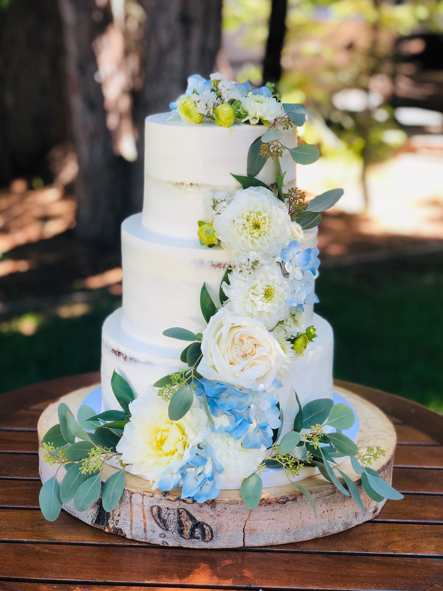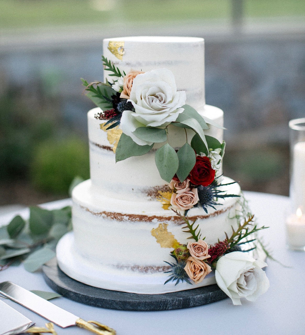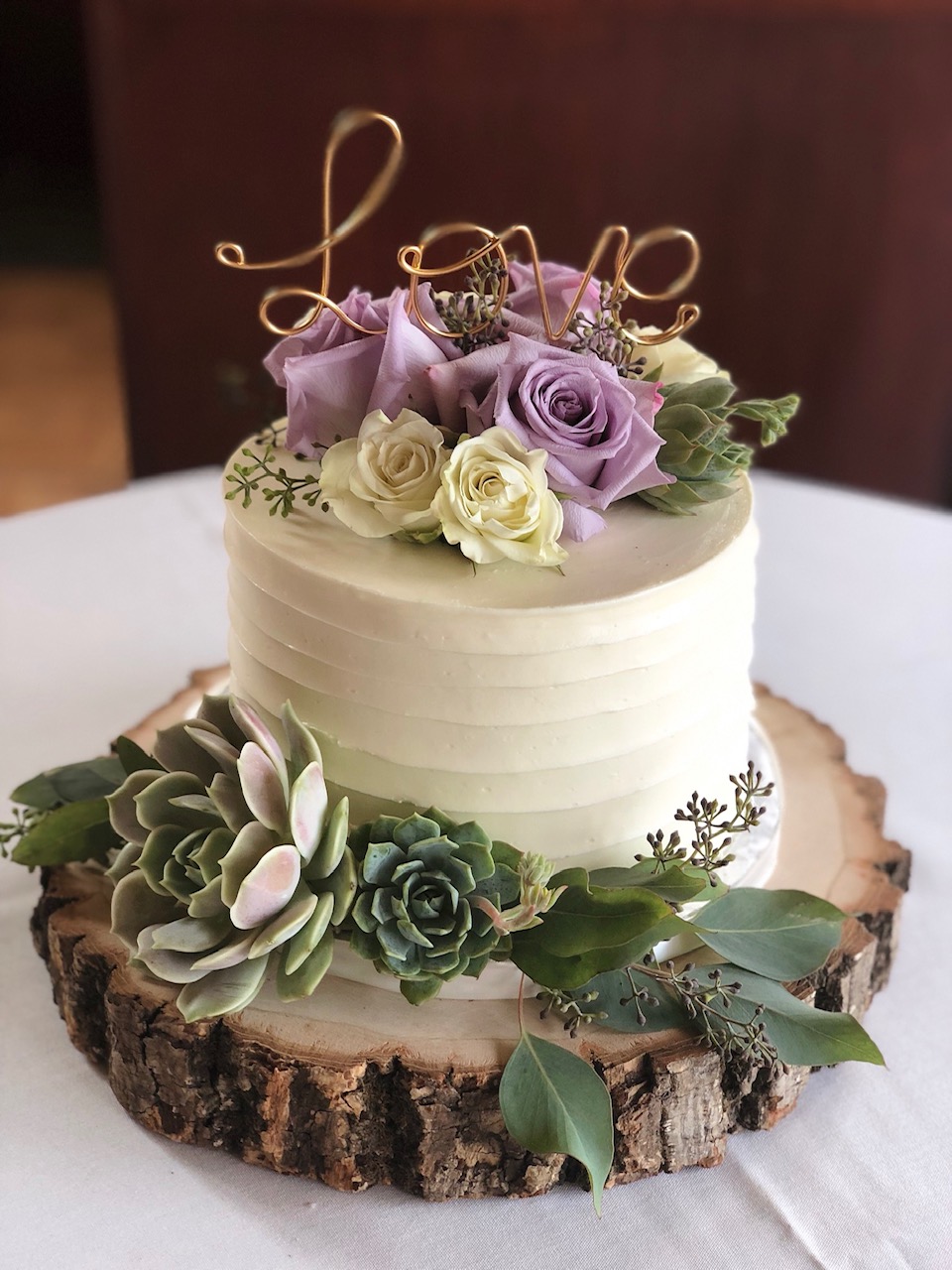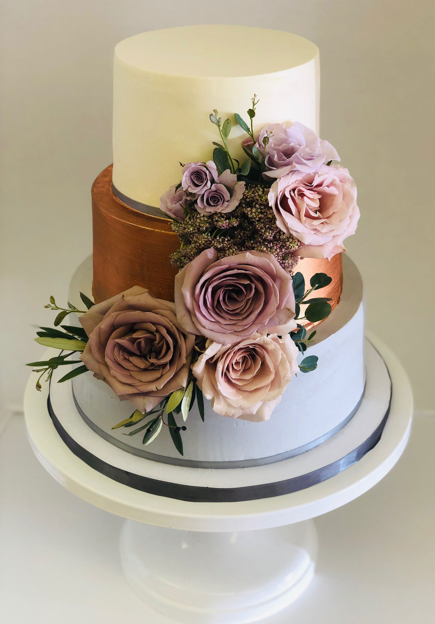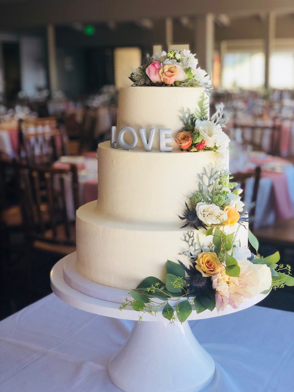 - Buttercream, white roses & eucalyptus
